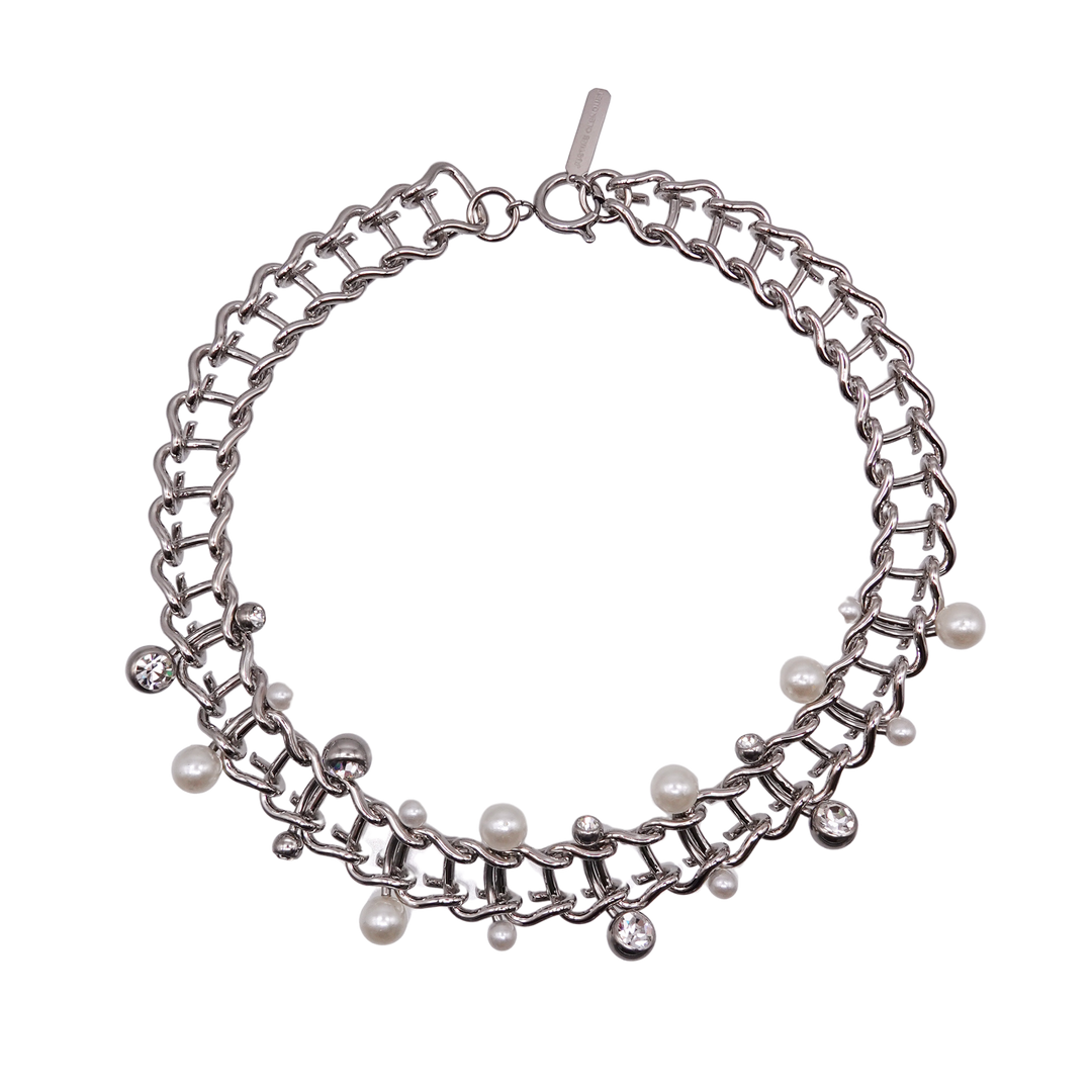 This choker necklace features curved bar piercings set with crystal embellishments. The necklace is crafted of palladium plated metal and measures 15″ in length and 1″ in width. It is secured with a spring ring closure.